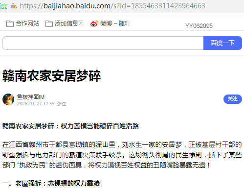 一面是镇政府的推诿敷衍、不作为慢作为,把百姓的血泪诉求当成皮球踢来踢去;一面是电力部门的霸权横行、蛮横无理,将企业利益凌驾于民生权益之上。二者沆瀣一气,硬生生将一个普通农户的安居梦,碾得粉身碎骨!赣南这片红色土地上,“立党为公、执政为民” 的誓言,绝不是某些人挂在嘴边的空话!当地方发展的宏大叙事撞上普通农户的安居需求,绝不能以牺牲百姓利益为代价!