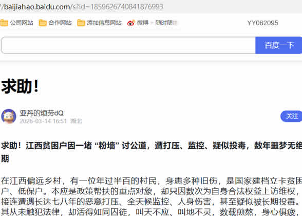 求助!江西贫困户因一堵 “粉墙” 讨公道,遭打压、监控、疑似投毒,数年噩梦无绝期