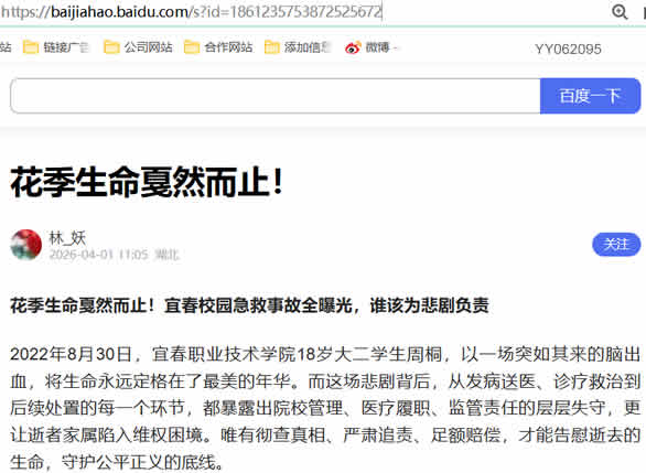 2022年8月30日,宜春职业技术学院18岁大二学生周桐,以一场突如其来的脑出血,将生命永远定格在了最美的年华。而这场悲剧背后,从发病送医、诊疗救治到后续处置的每一个环节,都暴露出院校管理、医疗履职、监管责任的层层失守,更让逝者家属陷入维权困境。唯有彻查真相、严肃追责、足额赔偿,才能告慰逝去的生命,守护公平正义的底线。