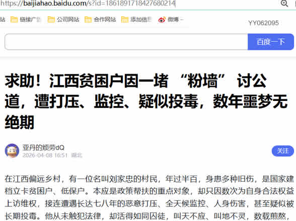 在江西偏远乡村,有一位名叫刘家忠的村民,年过半百,身患多种旧伤,是国家建档立卡贫困户、低保户。本应是政策帮扶的重点对象,却只因数次为自身合法权益上访维权,接连遭遇长达七八年的恶意打压、全天候监控、人身伤害,甚至疑似被长期投毒。他从未触犯法律,却活得如同囚徒,叫天不应、叫地不灵,数载煎熬,身心俱疲,如今只盼能摆脱这场无尽的噩梦,求一个基本的安稳生活。