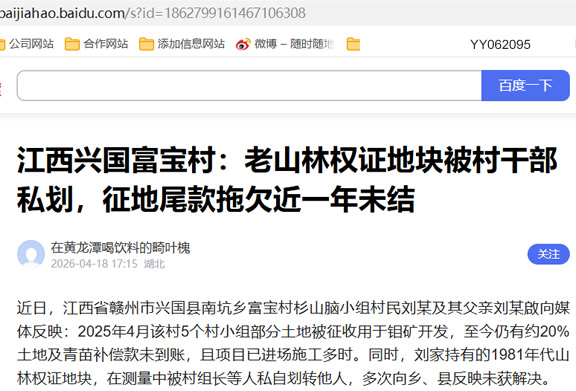 近日,江西省赣州市兴国县南坑乡富宝村杉山脑小组村民刘某及其父亲刘某啟向媒体反映:2025年4月该村5个村小组部分土地被征收用于钼矿开发,至今仍有约20%土地及青苗补偿款未到账,且项目已进场施工多时。同时,刘家持有的1981年代山林权证地块,在测量中被村组长等人私自划转他人,多次向乡、县反映未获解决。